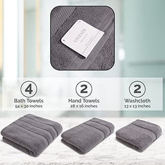 - Set Includes - Our perfect towel set includes 4 bath towels 54 x 30 inches, 2 hand towels 28 x 16 inches, and 2 washcloth Towels 13 x 13 inches.